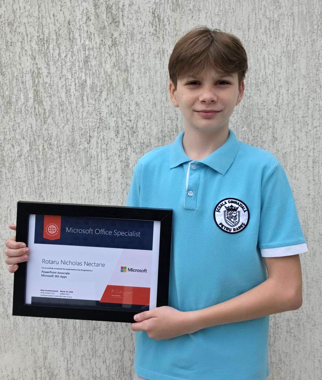 Îl felicităm pe elevul nostru Rotaru Nicholas Nectarie pentru reușita deosebită – calificarea la Campionatul Național Microsoft Office Specialist, la specialitatea Microsoft Office Specialist PowerPoint 365. Nicholas este singurul elev de gimnaziu din România care a obținut unul dintre cele zece locuri calificante la faza națională, aliniind astfel școala noastră la startul competiției alături de universități și licee de prestigiu din întreaga țară.